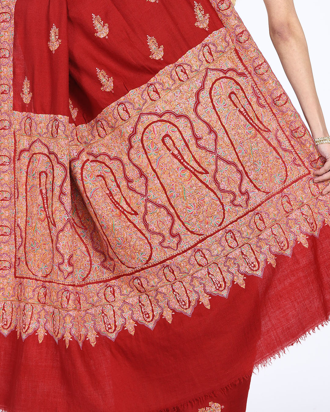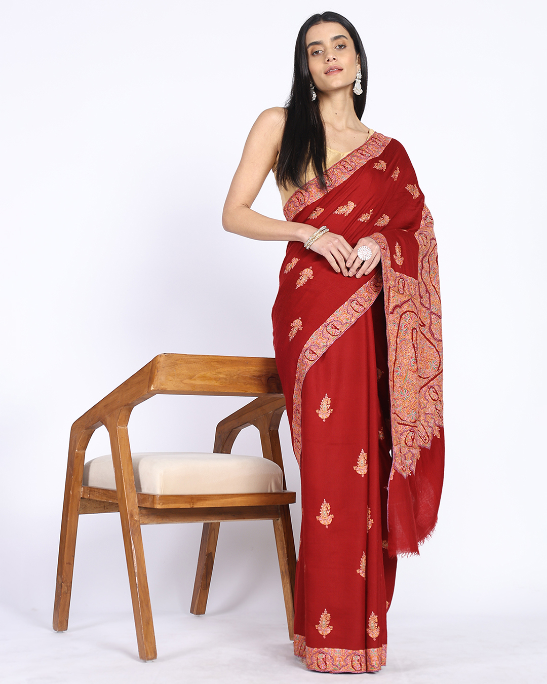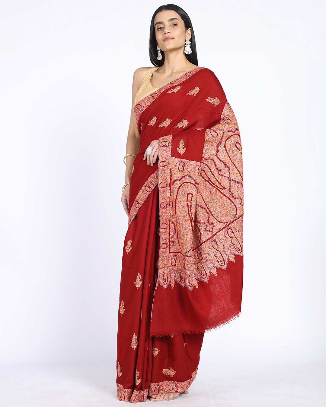 Woven by hand over months and brought to life with intricate embroidery, this Pashmina saree in deep red carries the quiet weight of devotion. Its broad hand-embroidered border frames the drape, while golden yellow motifs dance across it like sunlight caught in still air. Wearing it, you feel a gentle power, a sense of presence, poise, and wonder that grows with every movement, as if the fabric itself has a story to tell.