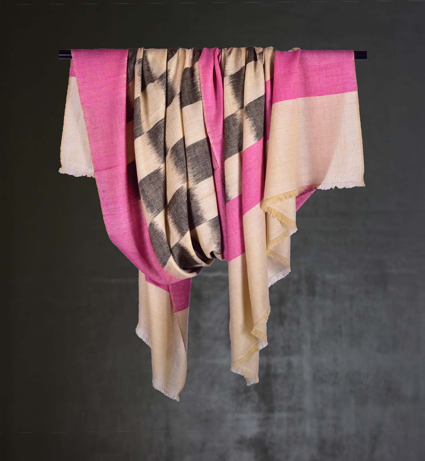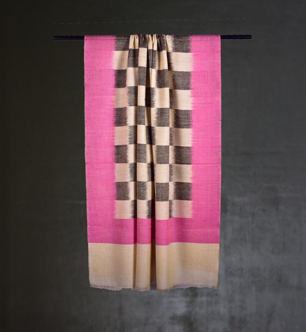 A striking interplay of form and color, this creamy white pashmina shawl is framed by a bold pink border enclosing deep chocolate brown squares. Woven with the intricate Ikat technique, each pattern emerges with a soft, blurred artistry— a testament to the finesse of handweaving. A statement in contrast and refinement.