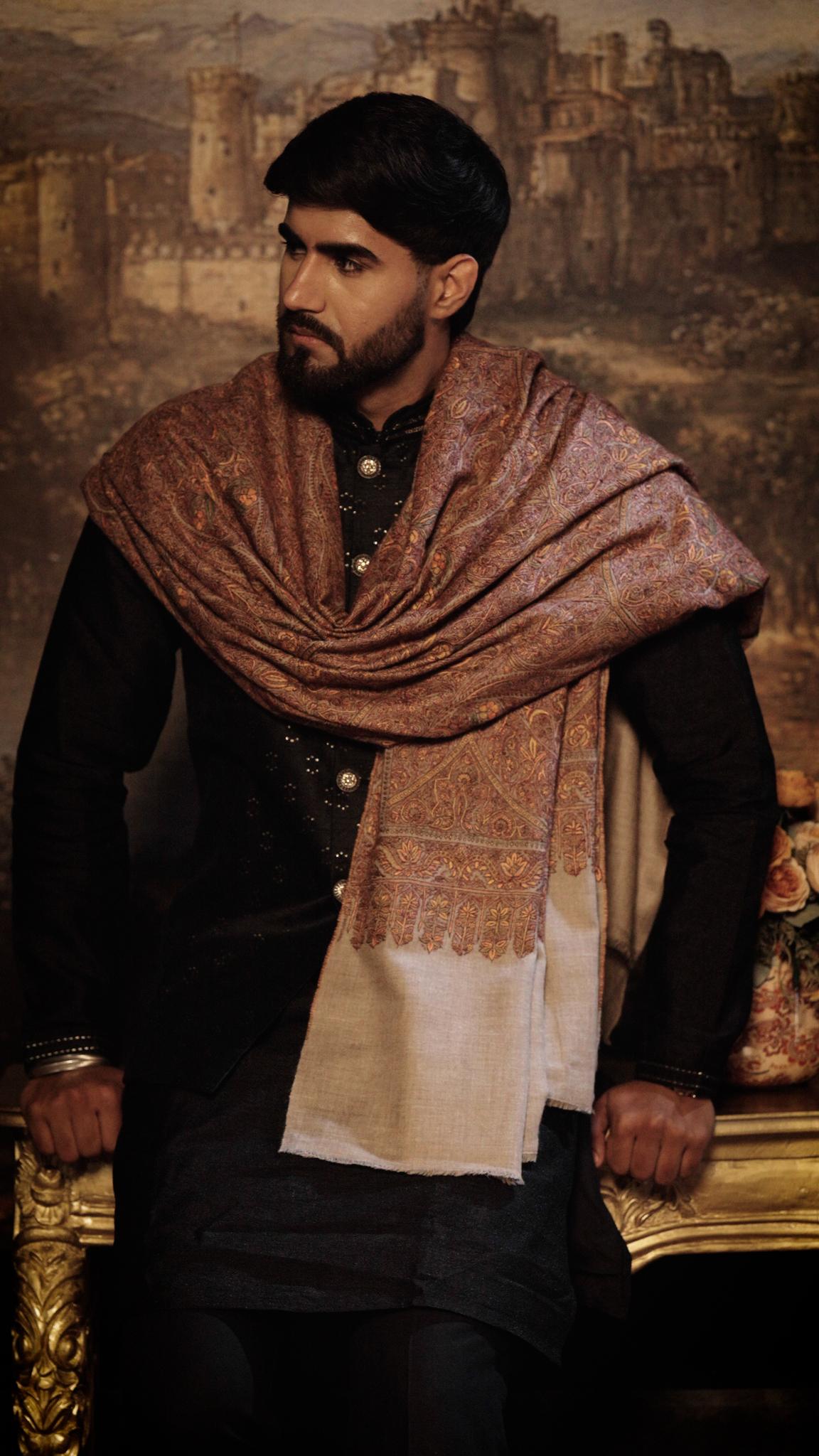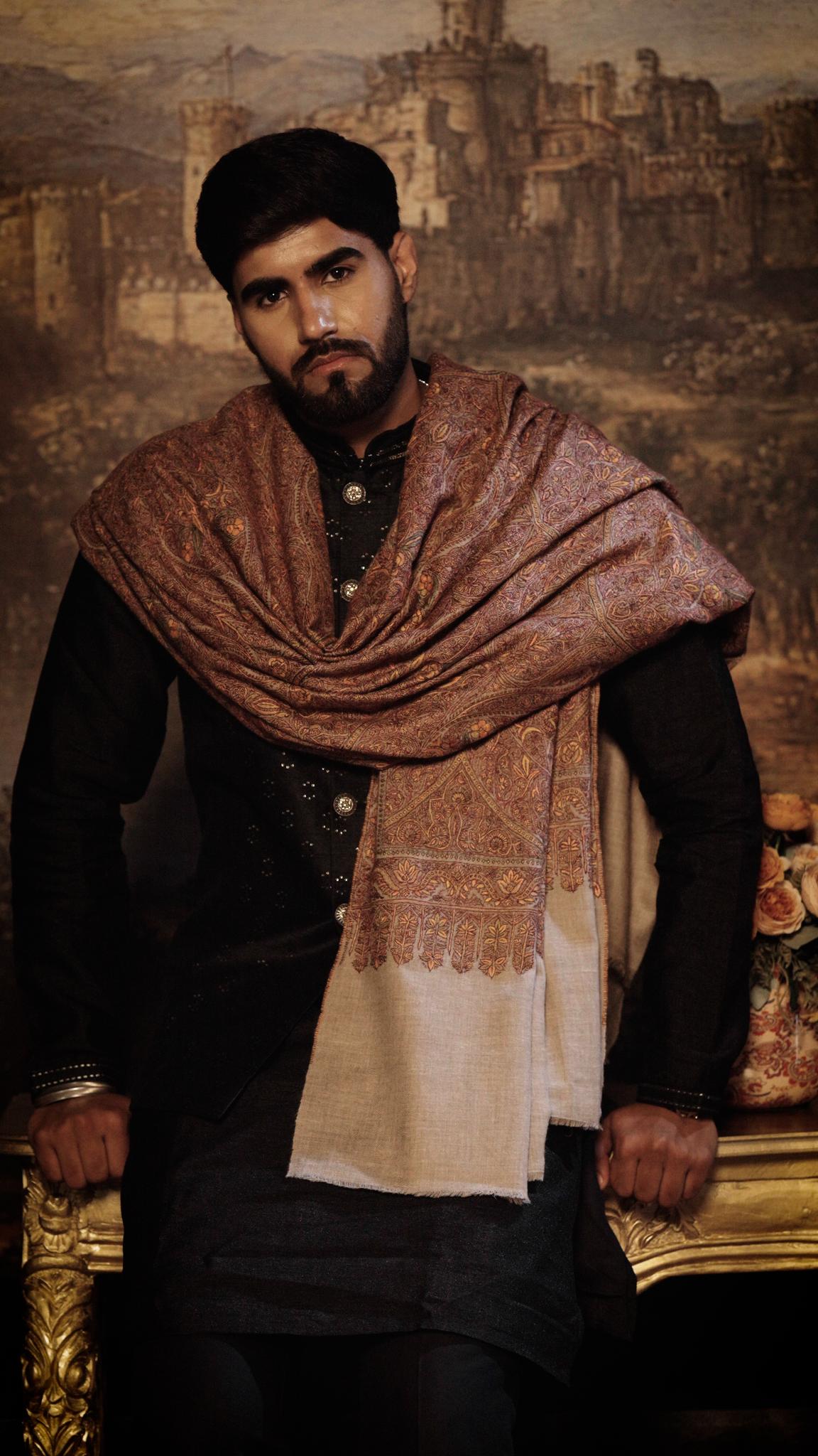 On a natural base of handwoven Pashmina, embroidery unfolds in layered tones of brown, intricate, unbroken, absolute. The density of the work conceals the weave beneath, each thread placed by hand with measured precision. Floral and vine motifs rise and intertwine, forming a field of detail that feels endless.