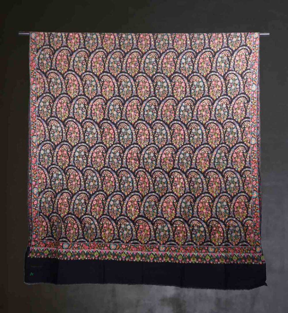 A rare and regal Jama Pashmina shawl, an extraordinary collector’s treasure that speaks of dedication and unparalleled artistry. Five years of meticulous hand embroidery have woven a symphony of paisley, floral, and vine motifs, each more exquisite than the last. The colors evoke pure wonder, their brilliance almost indescribable. Every intricate detail whispers of mastery — a creation so delicate, so profoundly beautiful, it leaves you utterly captivated.