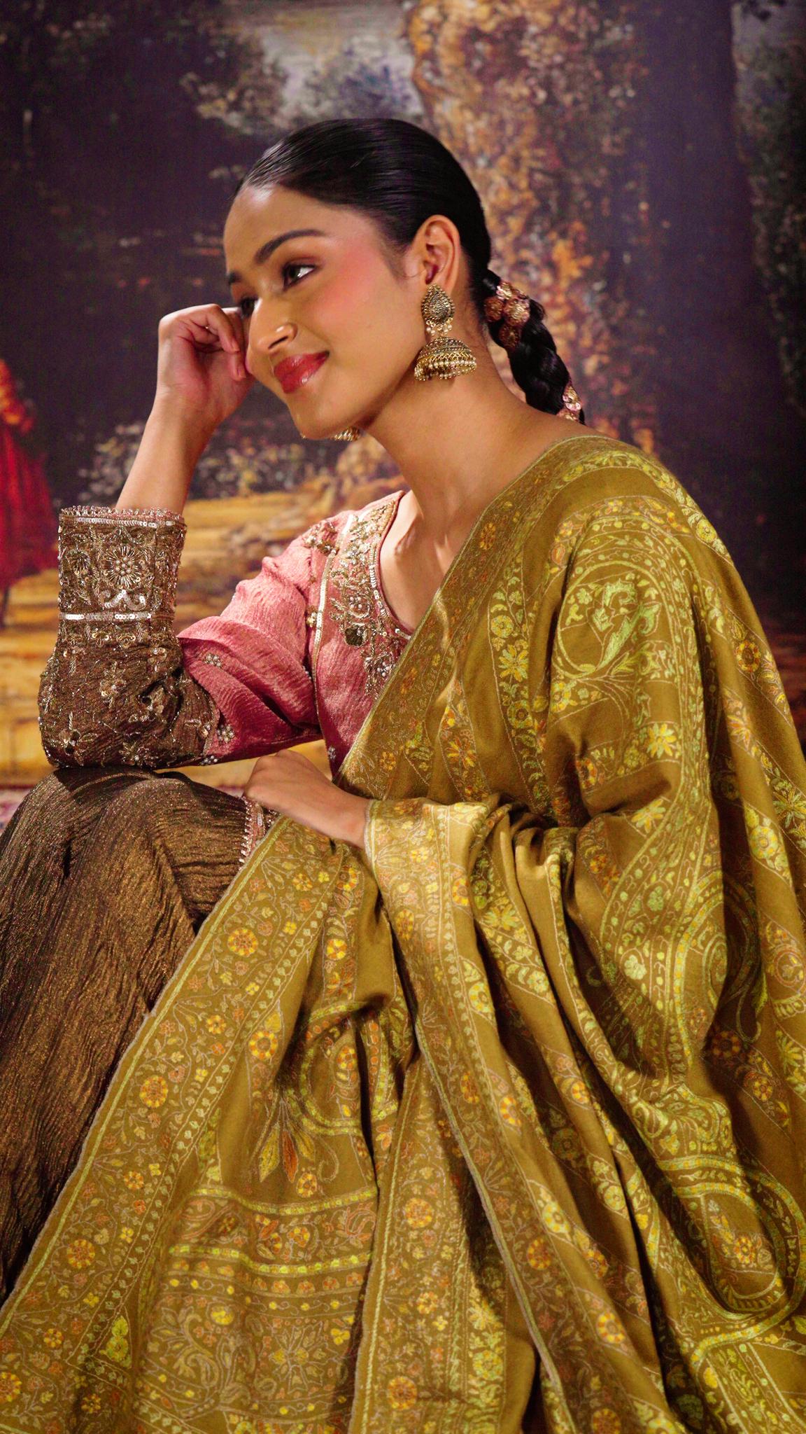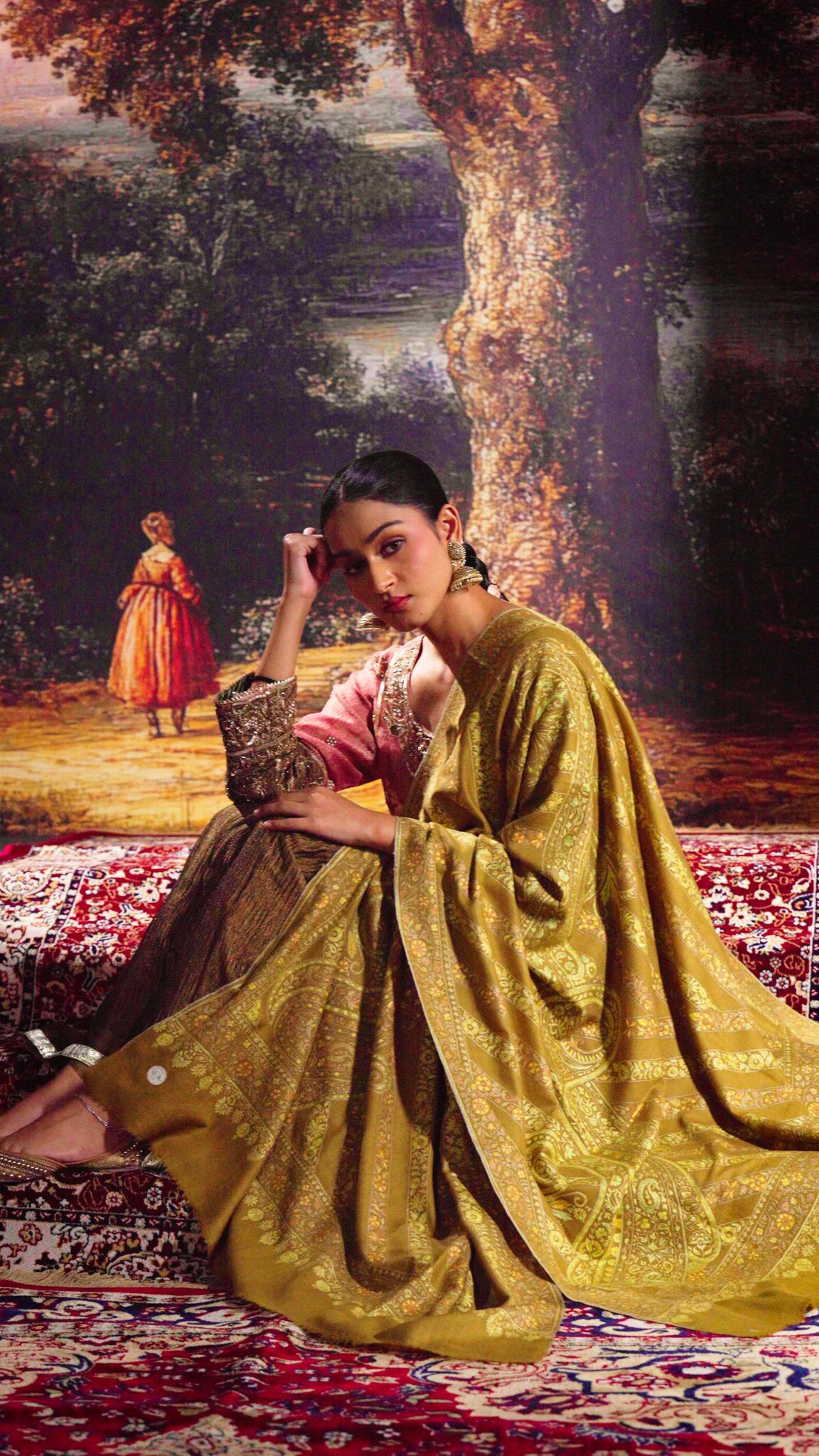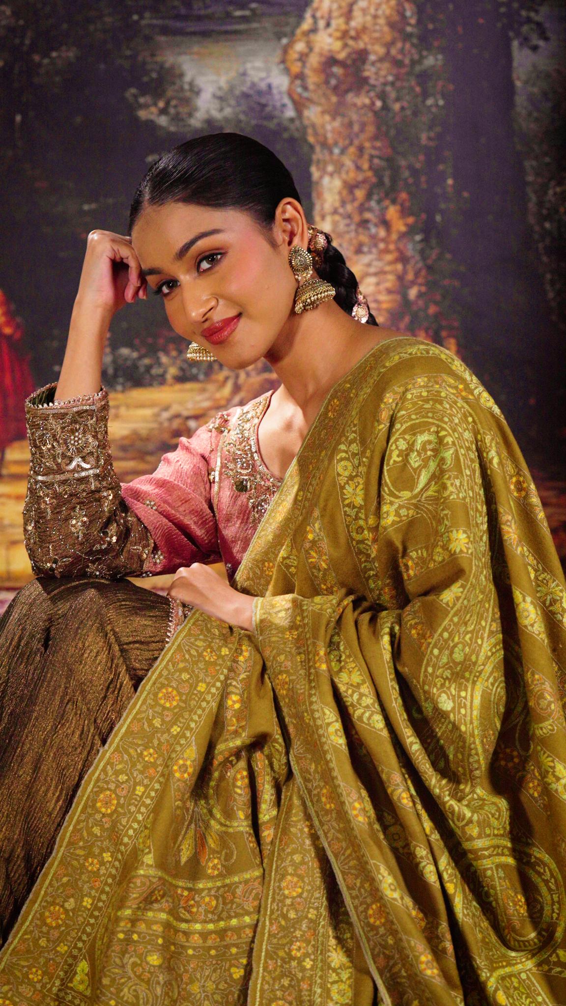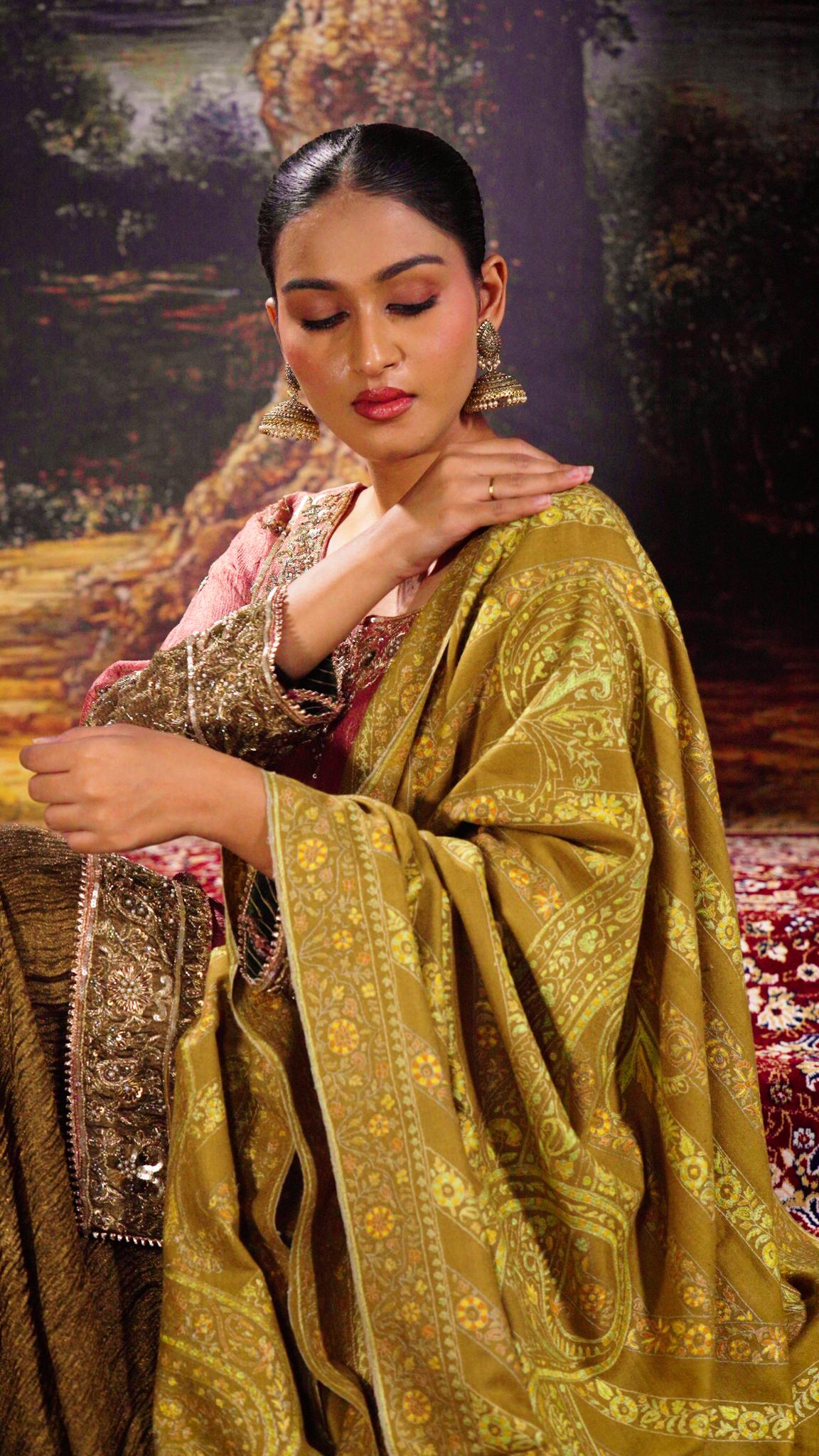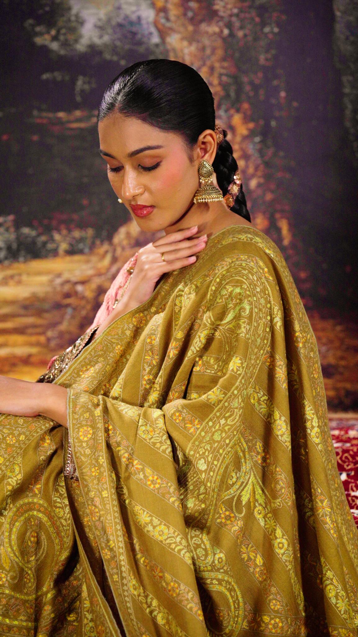 In its tranquil green hue, this handwoven Pashmina carries the stillness of spring after rain. Fine vines meander across its surface, hand-embroidered with unhurried grace. Each line follows the rhythm of a steady hand and a practiced gaze, a quiet dialogue between thread and fabric. It envelops with effortless warmth, alive with the touch of its maker.