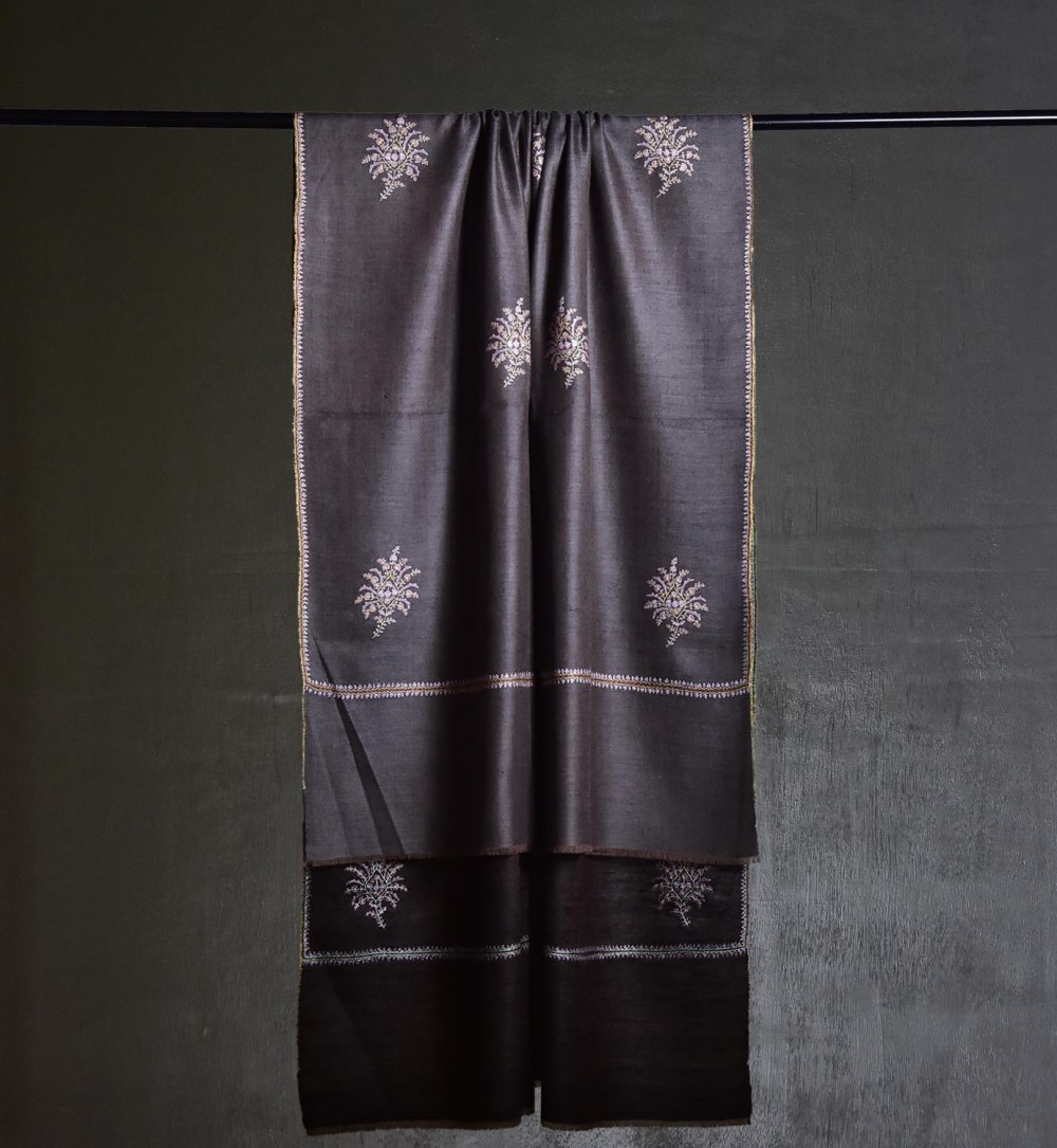 A canvas of pure handwoven pashmina, this charcoal grey stole is adorned with exquisite Buti Kaam—delicate floral motifs, each meticulously embroidered by hands that have perfected their craft over generations. Scattered like poetry across the fabric, these motifs embody Kashmir’s masterful artistry, while a finely embroidered border on all four sides frames the piece with understated grace.
