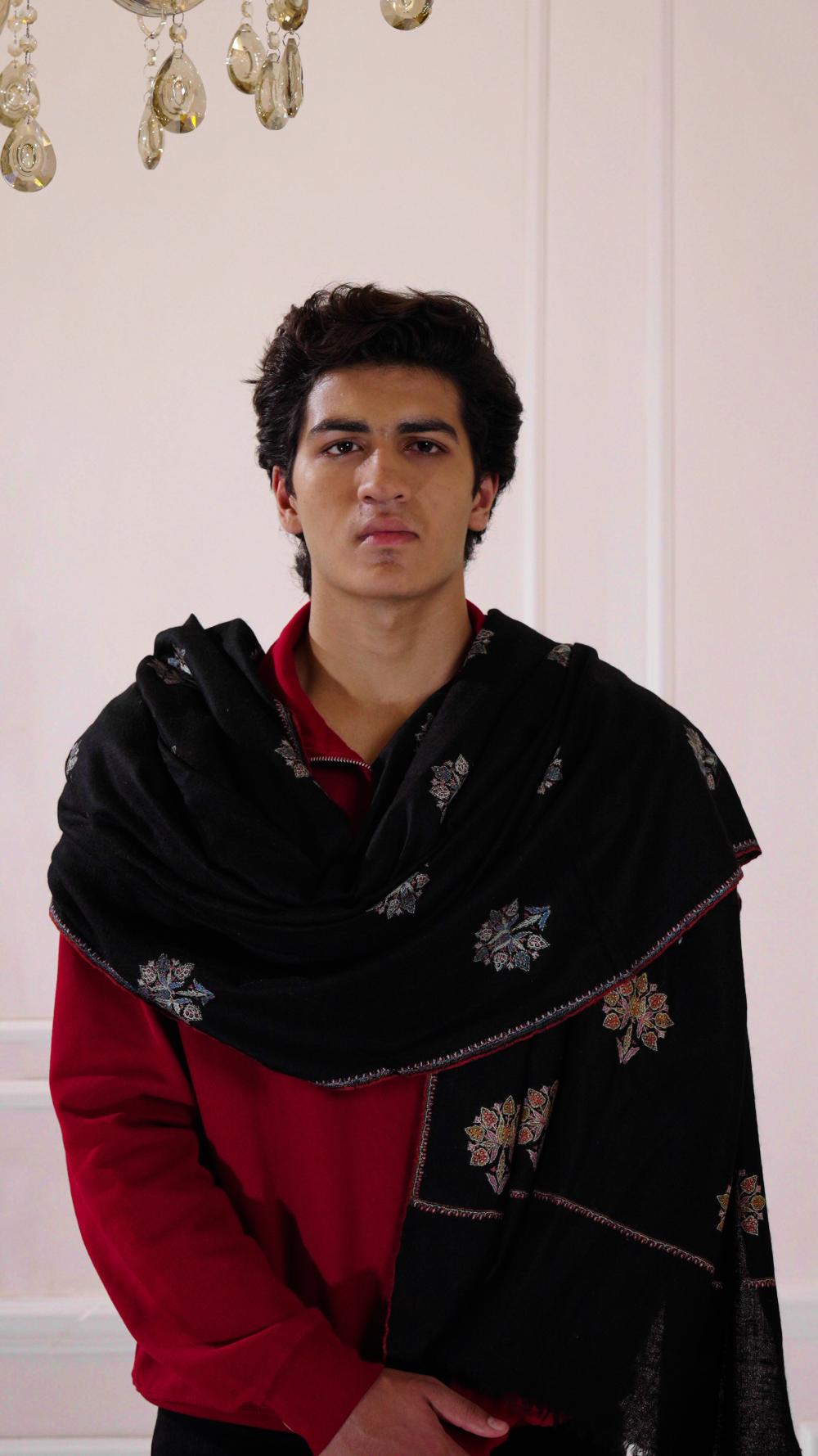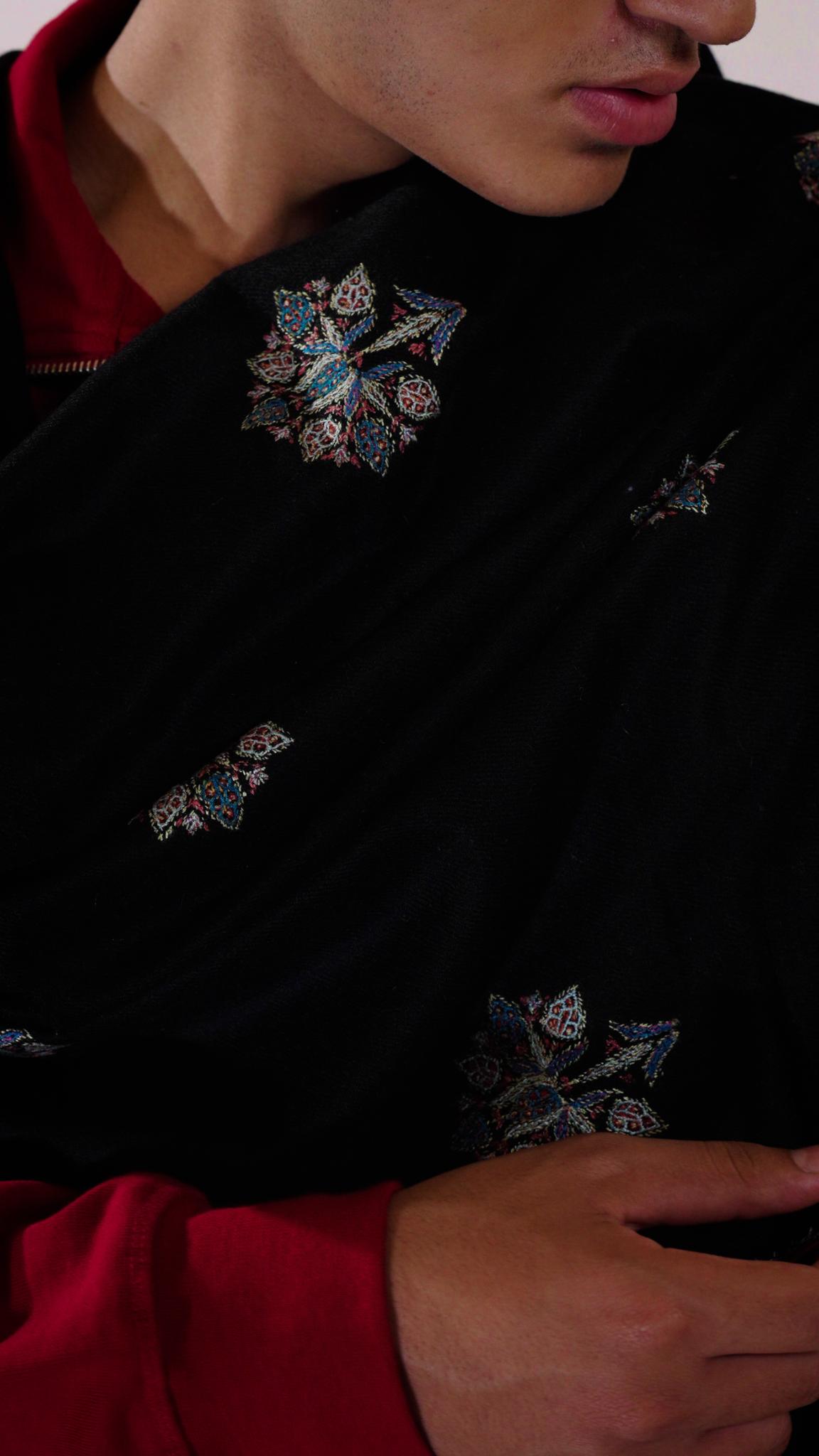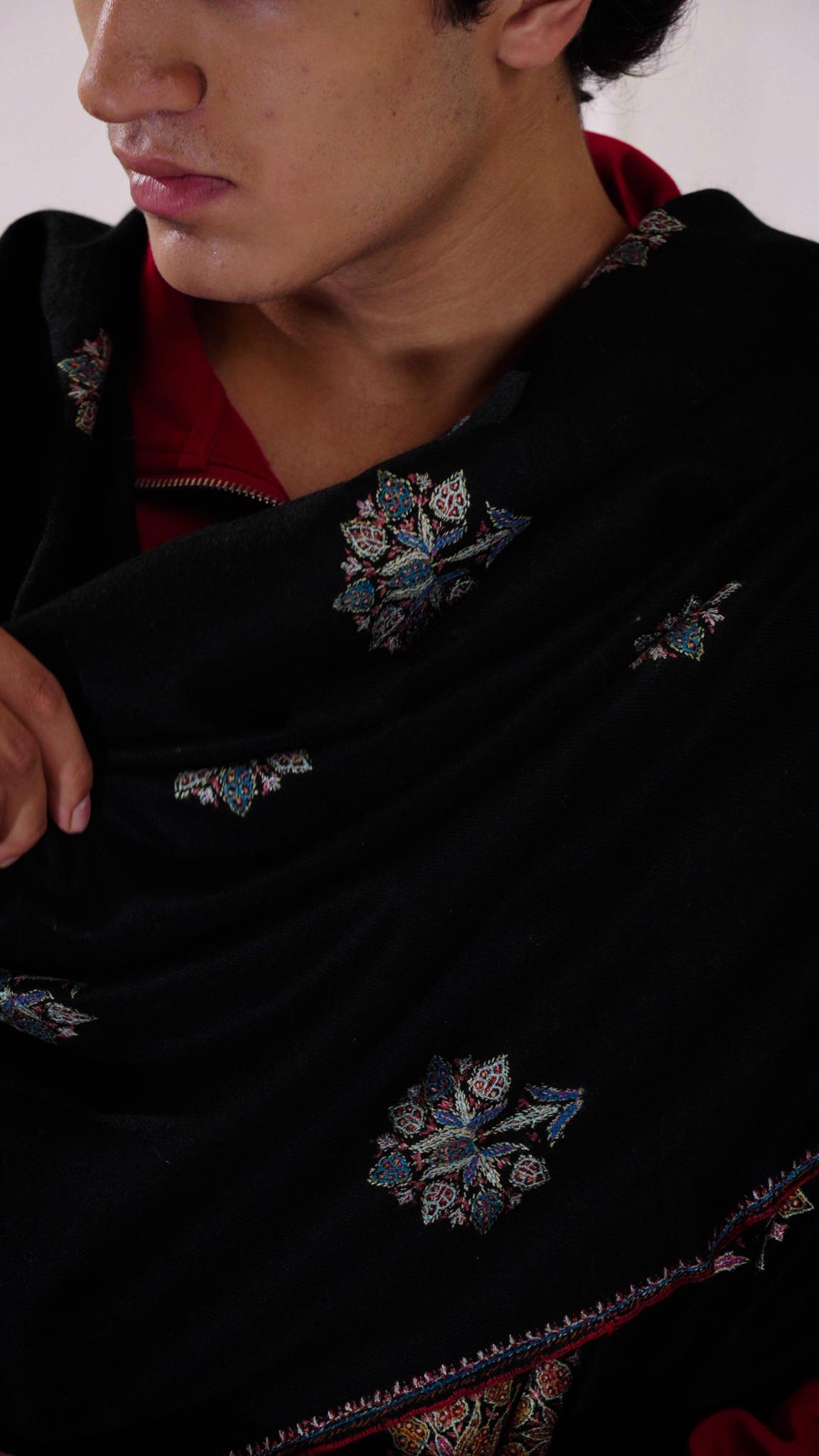 A refined Pashmina scarf in heritage black, exuding understated elegance. Crafted from the finest handwoven Pashmina, its luxurious luxurious hand-embroidery celebrate the essence of sophistication. A versatile piece, perfect for effortless style and enduring grace.