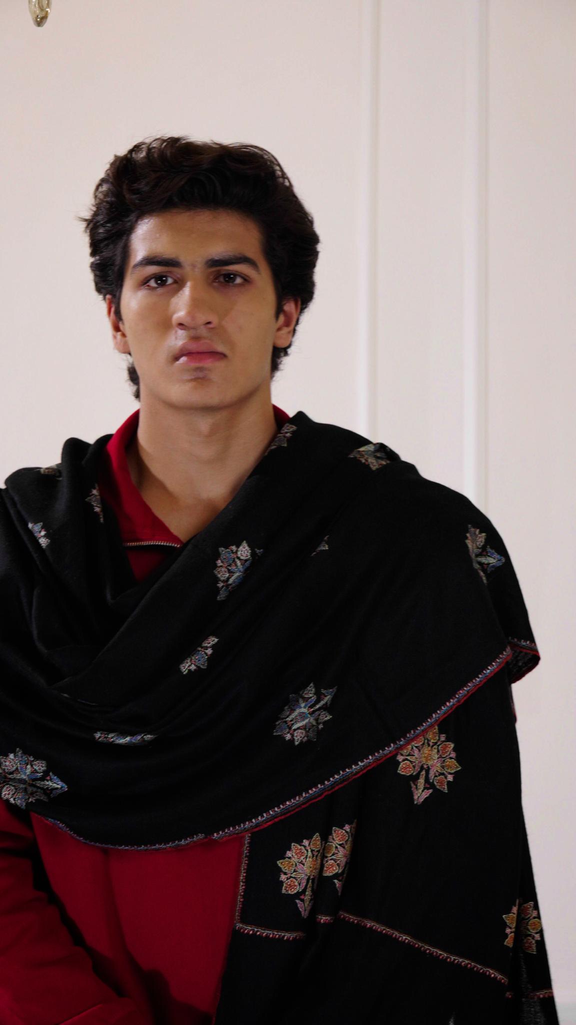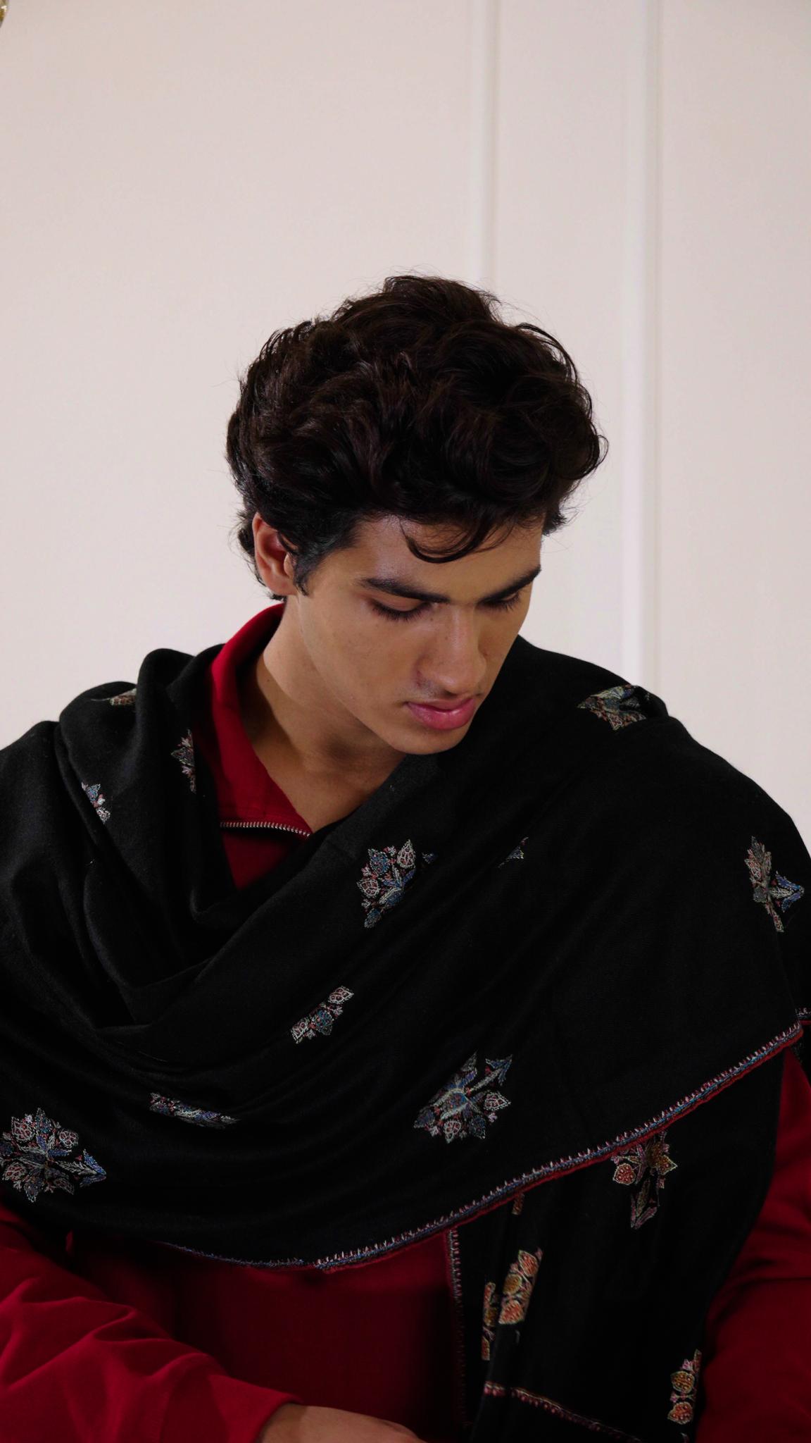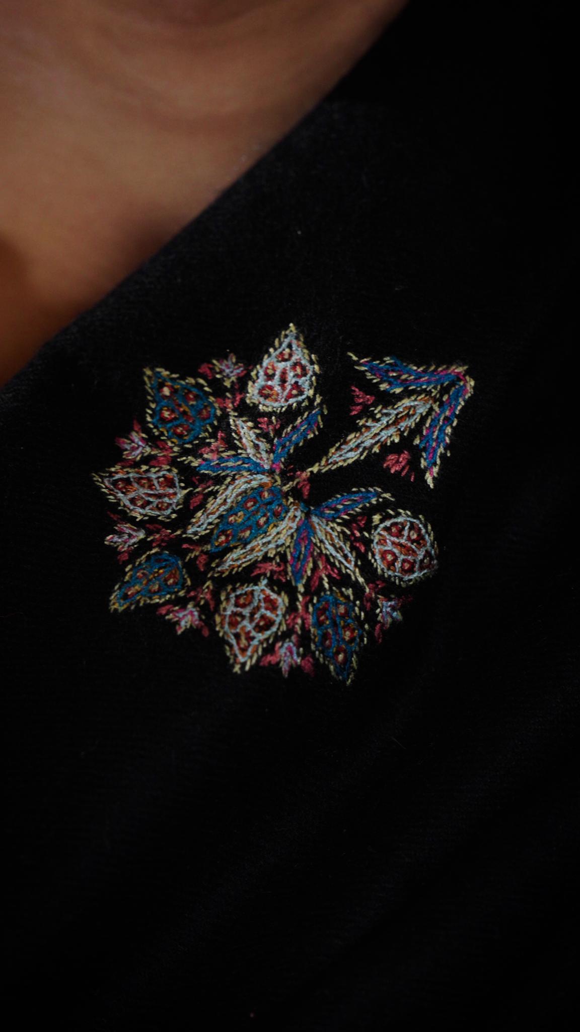 A refined Pashmina scarf in heritage black, exuding understated elegance. Crafted from the finest handwoven Pashmina, its luxurious luxurious hand-embroidery celebrate the essence of sophistication. A versatile piece, perfect for effortless style and enduring grace.